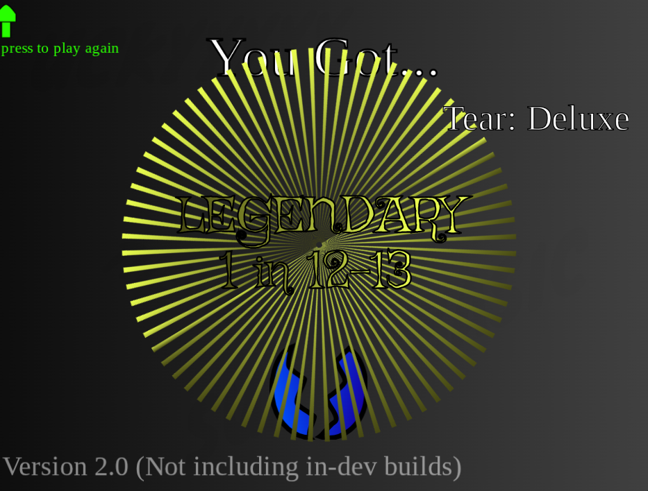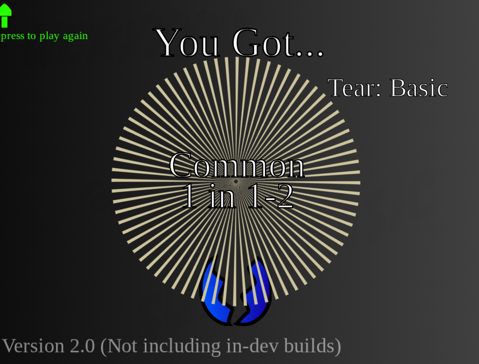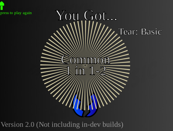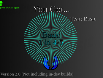 Basic Egg RNG is an RNG game that is a combination of mobile game loot boxes and RNG games on Roblox (sol's RNG) Directions: Click the egg multiple times to get a variety of titles that have a rarity (obviously) there is 13 titles at the moment and I plan on adding more. !!!THIS GAME HAS FLASHING LIGHTS DO NOT PLAY IF YOU ARE EPILEPTIC!!! or close your eyes during cutscenes.